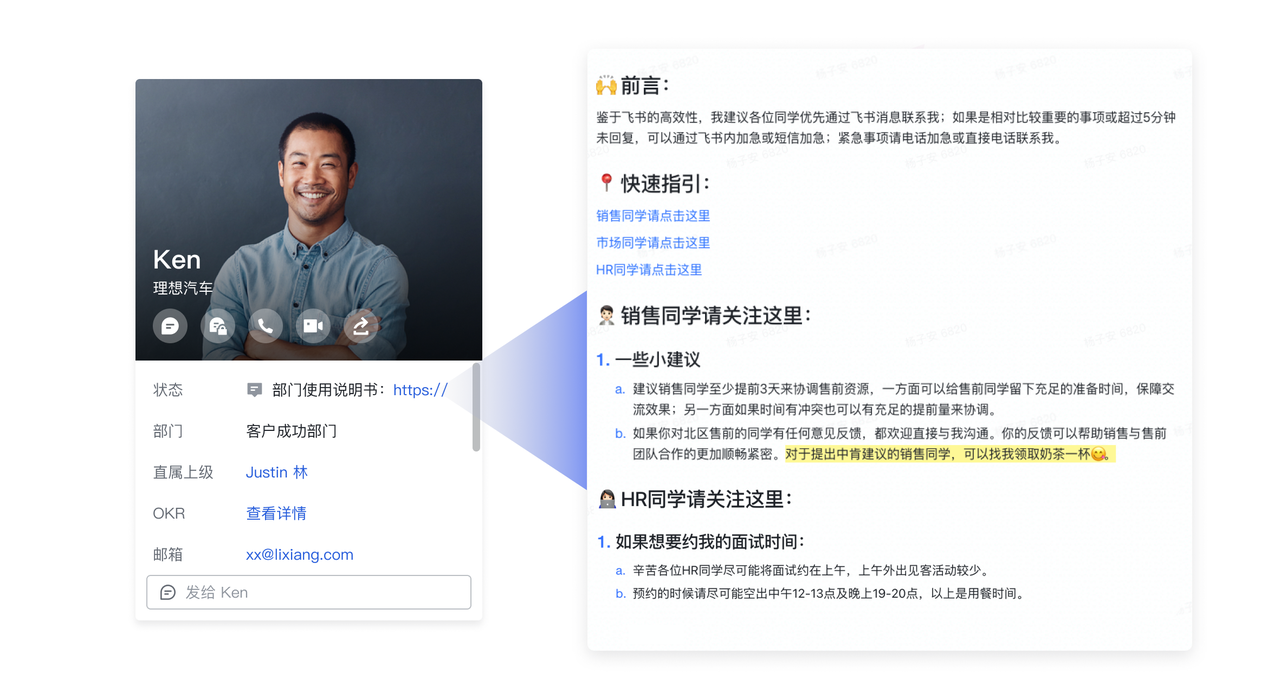 “這是一個巨大的感知工具。” 這是李想使用飛書後直接感受。信息的共享在飛書文檔中做到了超卓,小到銷售數據,大到公司戰略,都可以沉澱在飛書文檔裏随時查閱。在過去,李想用 PPT 承載戰略的思考,當内容不斷更新,每個人手中的版本不盡相同。用飛書文檔便告别了這個情況,不但讓修改成本變低,信息的同步也變得高效。受此啓發,許多理想汽車員工把個人和部門介紹做成飛書文檔鏈接,放入個人簽名檔中。