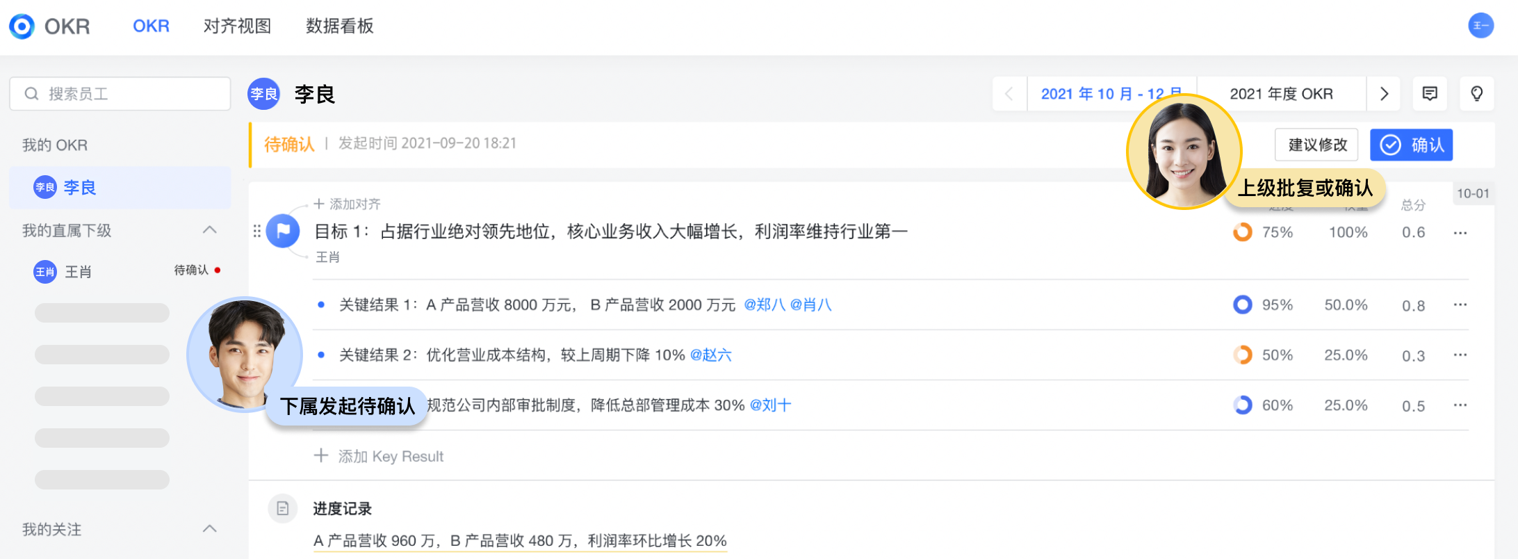 跟進永遠是 OKR 重要的環節。對問題的發現和解決,其實是保障公司目标不斷實現。在理想汽車,每周一都會舉行公司級 OKR 會議,總結 OKR 進展與問題,并讨論下一步行動。過去參會人需要将 OKR 手動粘貼到文檔中,開會時對照讨論,花費大量精力。如果 OKR 在會前發生變更,會上又需要花時間溝通、調整,會後再切換回 OKR 系統,手動記錄。如今,複盤時直接在飛書文檔中插入 OKR ,并在每條 KR 中快速添加進展,省去手動粘貼和反複修改。