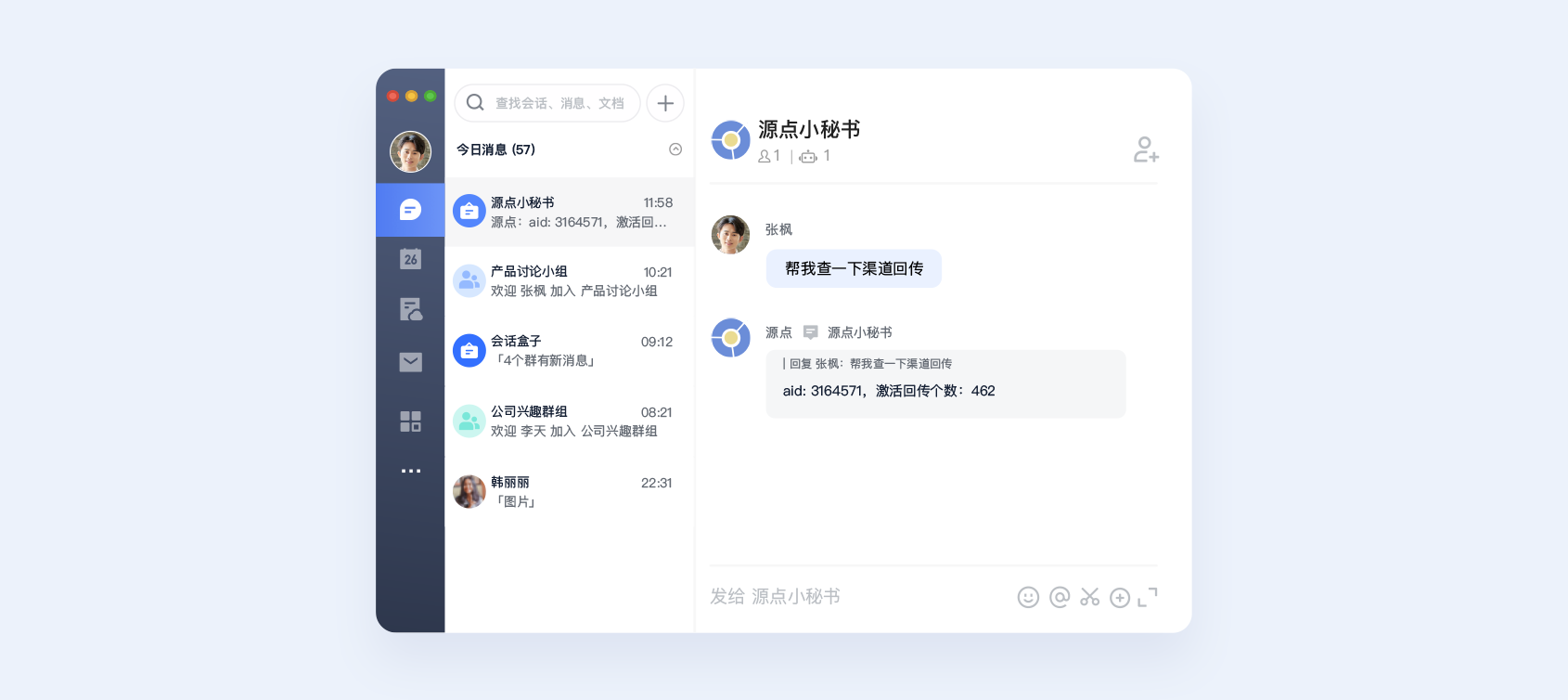 全員使用飛書後,工程師利用開放的API接口開發了一個機器人,将原有系統與飛書打通。機器人上線後,公司内部所有人都可以通過搜索框找到它,隻需要說一句“我要日活數據”,給定時間範圍等必選項,機器人就會快速查詢并自動返回實時數據,十分方便,很快就在全公司推廣開來。