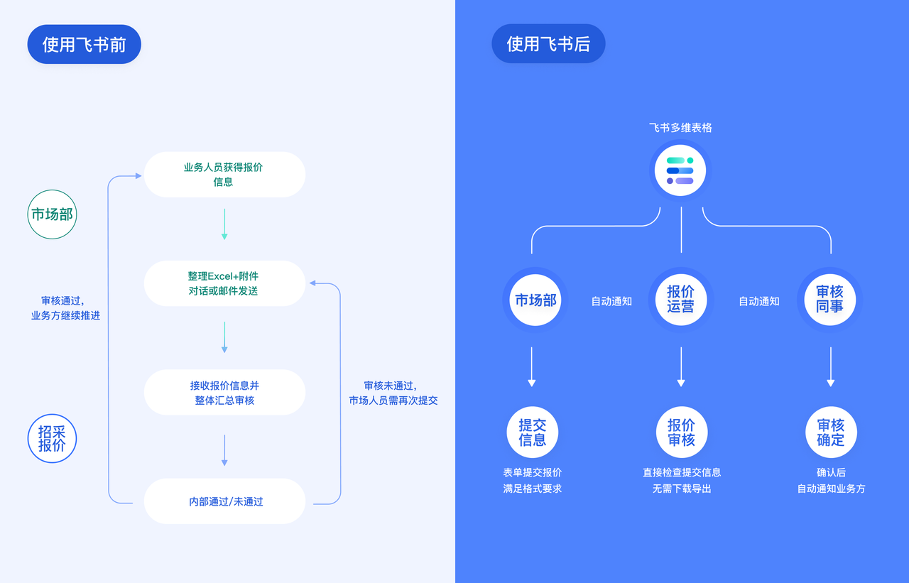通過多維表格,中海供應鏈企業輕松搭建一套輕量級的詢報價系統,把詢報價工作自動化、可視化。現在市場部門隻需在多維表格中,提交對應報價信息即可。不但簡單,也通過格式設定規範了流程。多維表格還支持自動化通知,接收到信息後運營人員便能第一時間接收到通知,反之,通過後也能自動通知市場人員快速推進。顯然,這大大減少了運營人員的反複溝通,一張表就能把控所有的報價管理。
