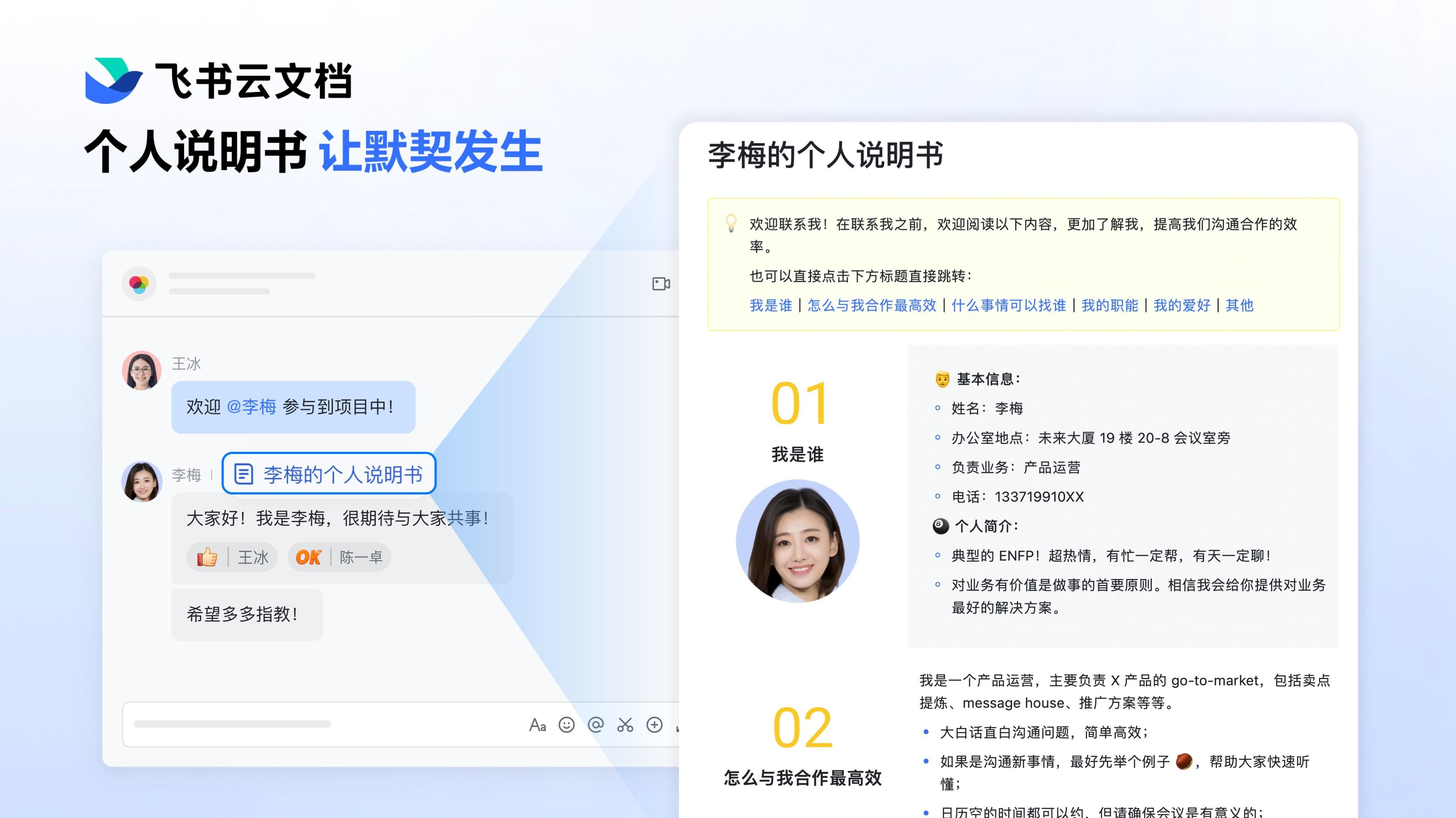 在去年的發布會,大家可能還記得,我們發布了「個人說明書」。個人說明書就是一個挂在你簽名檔上的一個文檔,非常簡單,别人和你聊天之前,可以先看你的個人說明書,建立對你的第一印象。