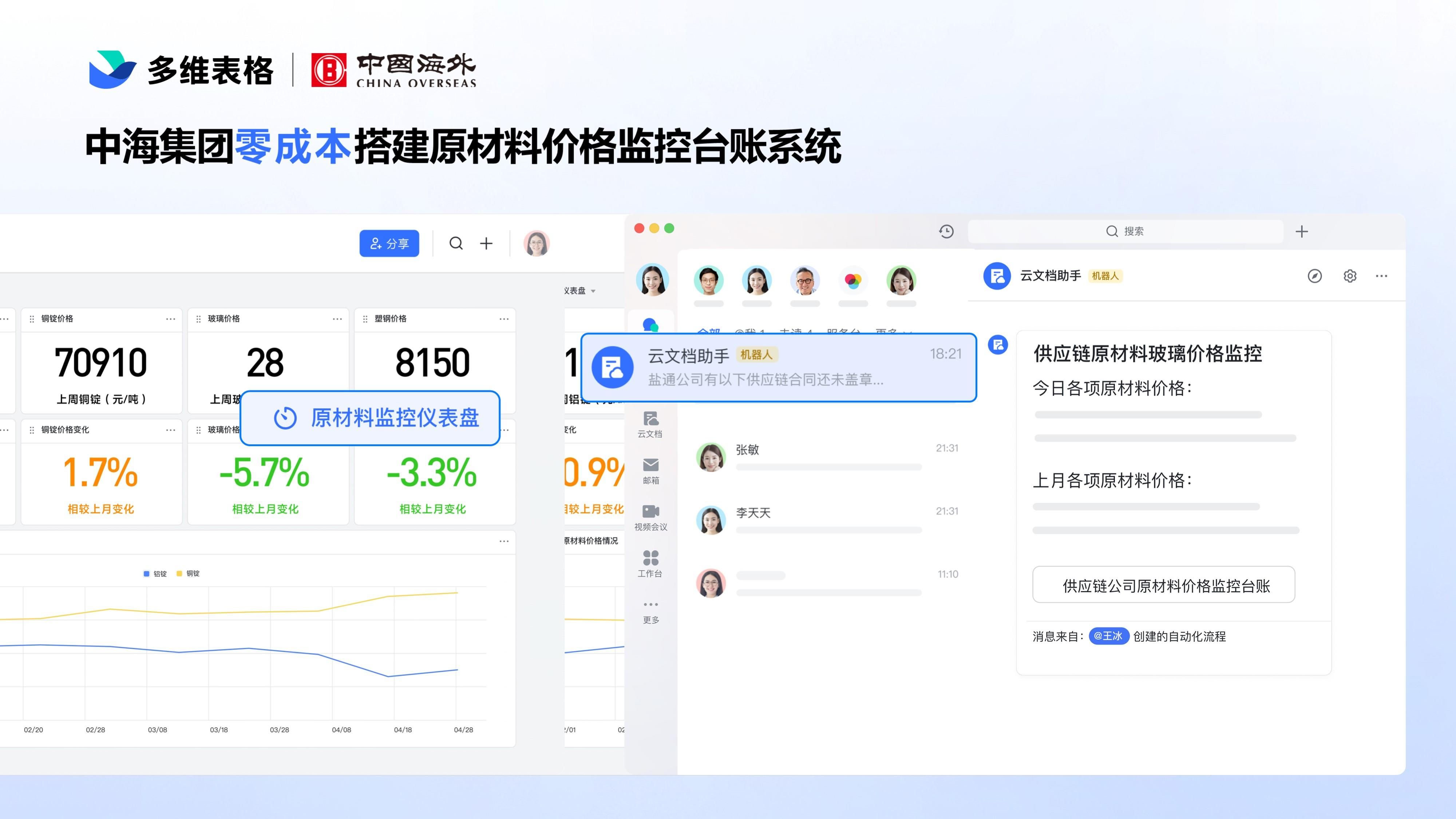 他還搭了一個原材料價格監控台賬系統,以前,這樣的價格信息,都存在 Excel 裏 ,找起來很麻煩,各地區的 Excel 還不同步,沒法做好原材料采購管理。現在,用多維表格,原材料價格一有變動,就會自動推送給各地區負責招标采購的同事,讓大家能夠拿捏市場行情。