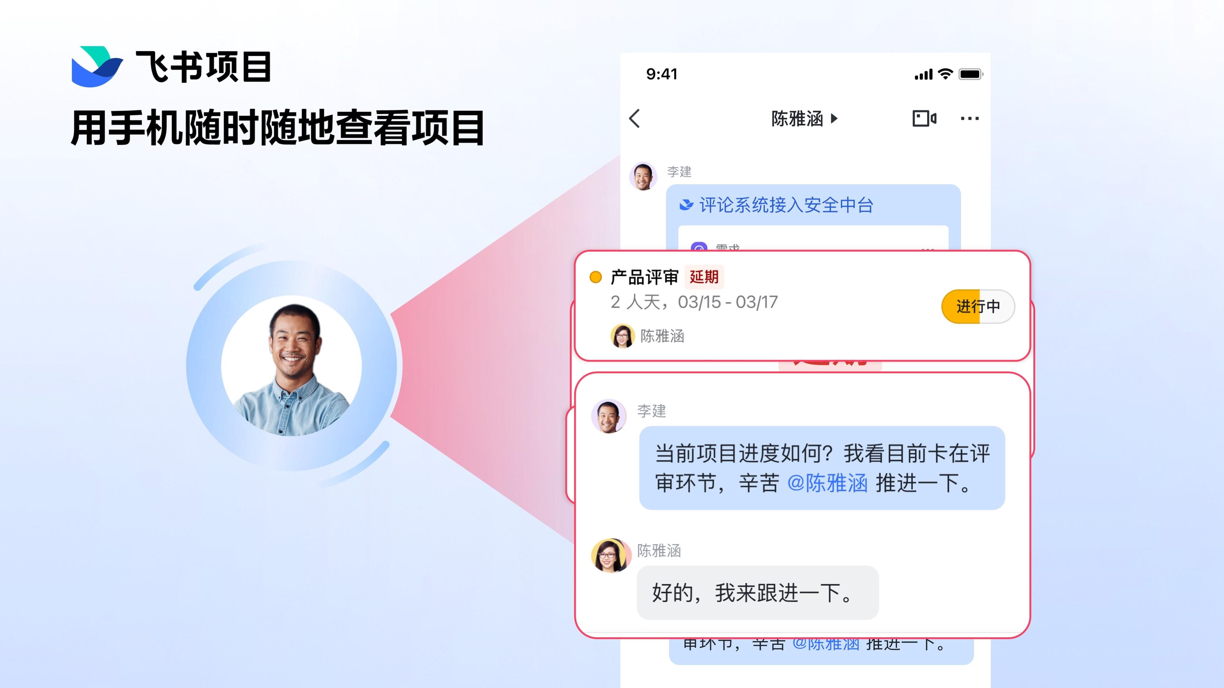飛書項目還能直接跟飛書的消息打通。比如當重點項目發生延期,李總就會在飛書消息裏,收到飛書項目發來的警報。李總點開消息,在飛書裏就能看到項目裏面的全貌,比如說流程、背景、卡點和對應負責人。這樣李總就可以馬上從飛書發起溝通,直接讓事落實到人。