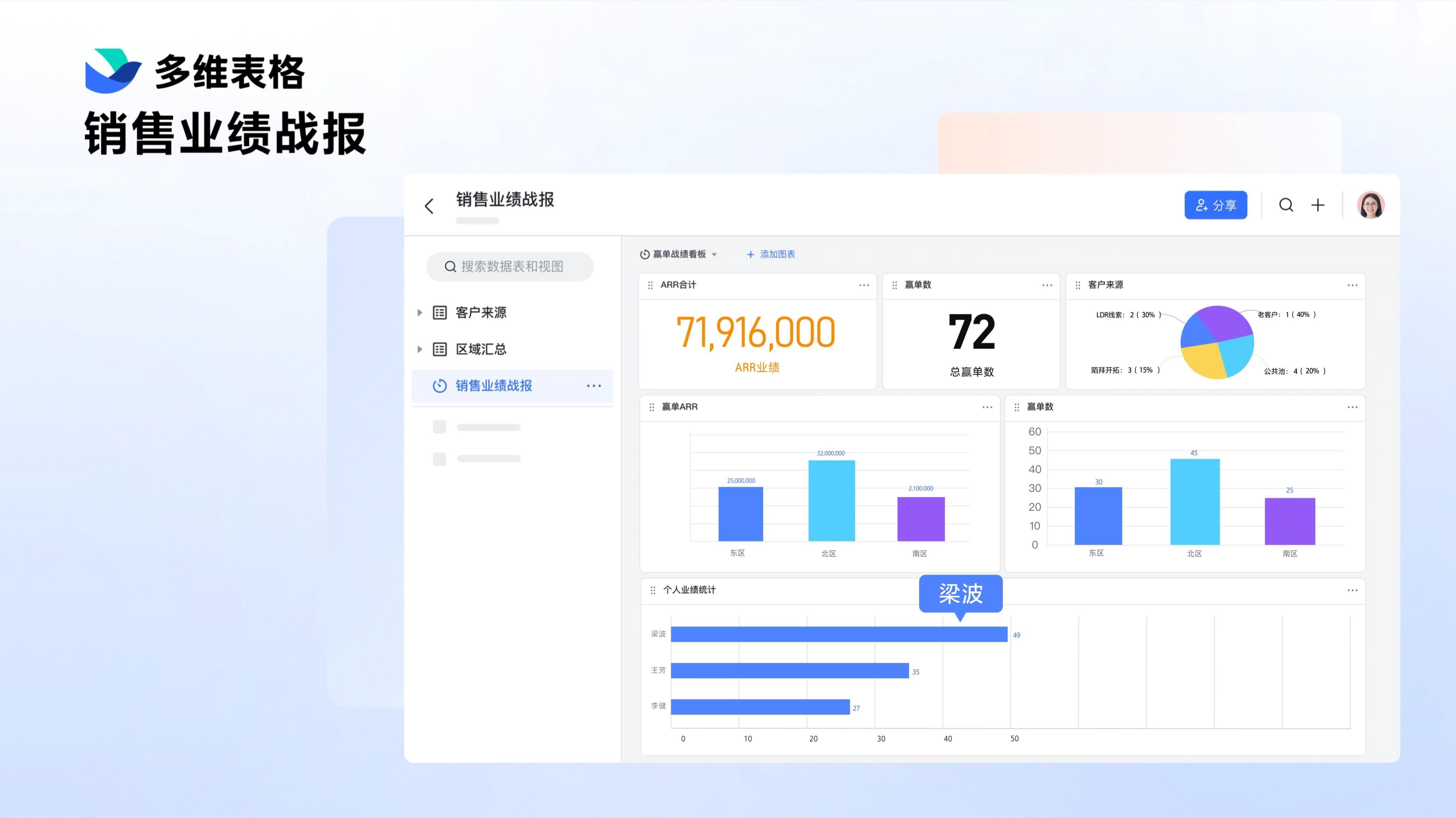 銷售業績戰報——哪個産品賣得好、哪個區域單子少了、誰是銷售冠軍、這半年的銷售額複盤,掃一眼心中就有數。