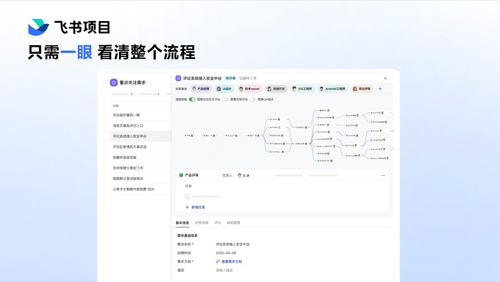 這樣一天下來,小張白天全是會,晚上才有時間寫代碼。現在,有了飛書項目的流程圖,小張的協作方再也不用到處問。因爲所有人都能用這個流程圖,看到項目的進度。而小張也能用流程圖主動獲取他想要的信息,比如當他接到一個需求,他可以點擊「需求評審」節點,就能看到産品經理寫的需求文檔,不用到處找;在設計師負責的「設計節點」,他也能看到産品的原型圖。
